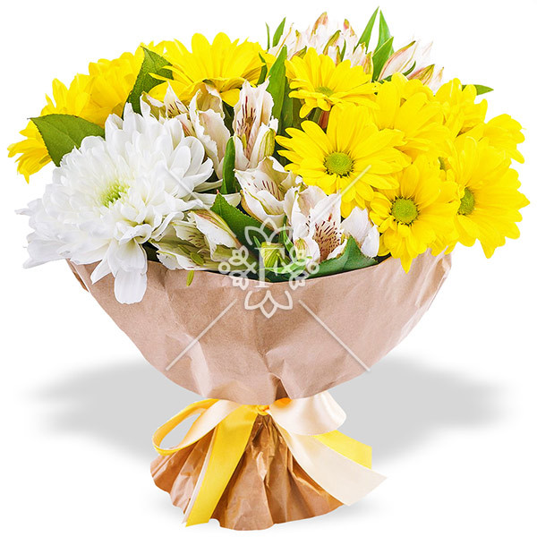 Хризантема белоснежная и желтая, сочетаясь, наполняют всю композицию невесомостью и радостью. Дополняет это цветочное совершенство - альстромерия белого цвета. Простое, но эффектнное сочетание!